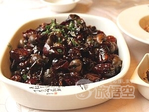 このレストランは、回螺(たにし)料理が有名で、ビニール手袋をはめてタニシを持ち、竹串で中の身を取り出して頂きます。唐辛子と花椒がお皿に溢れるほど使用されていますが、目ためほどは辛くなく、ほのかに唐辛子の甘い香りがします。ただ麻辣の本場、どれも山椒の風味が効いているので、苦手な人は辛さ控えめとリクエストされることをおすすめします。
