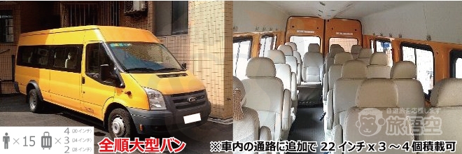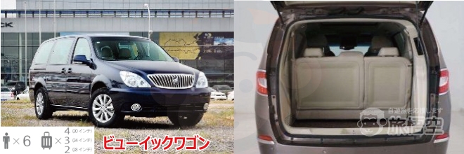 ・セダン車: 最大乗車定員 4名様 / スーツケース 2個 (Mサイズ) ・ワゴン車: 最大乗車定員 6名様 / スーツケース 4個 (Mサイズ) ・ミニバス: 最大乗車店員 14名様/ スーツケース 9個(Mサイズ) ※上記人数には運転手が含まれません。お客様の乗車定員となります。 |