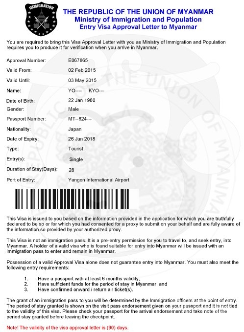 (日本籍の方も、ミャンマー渡航に際し、ビザ取得必要です)