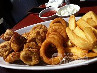 サラダ、パスタ、サンドイッチ、ピザ、クレープなどのメニューも。 お店オススメの~Angry Fish(big set)~を注文。 カラマリとオニオンリングも付いてます。 薄いサクッとした軽い衣は、少しスパイスがきいていてビールが進むお味。 店員さんのサービスも良く、wi-fiも使えるのでゆっくりできます。 |