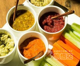 ~フムス・ディップ~は前菜や軽食にピッタリ。ビーツ、ニンジン、緑豆など10種類ほどありました。