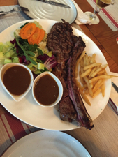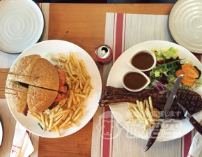 ショーケースにはずらりと種類豊富なお肉が! こちらから選ぶこともできますが、今回はフードメニューから注文しました。骨付きステーキ 1KGは見た目もど〜んとインパクトあり! ソースは数種類からチョイス。ハウススペシャルのハンバーガー〜Yasmine's ハウスバーガー〜はなんと3KG! パテ&バンズ&卵3個のボリューム。一人で一皿30分以内で食べられたら無料になり、店内の壁に名前が残せるそうです。チャレンジに参加する人も多いそうです。 シェアして頂く場合は、店員さんが綺麗に切り分けてくれますパテは塩胡椒のみのシンプルな味付け。四分の一も食べればお腹一杯に。フライドポテトはカリカリの表面が美味。 大人数でシェアして楽しんだり、好きな部位を選び調理してもらったりと、色々な楽しみ方が出来るお店です。 |