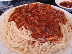 敦煌では知らない人がいないくらい有名店、茹でた麺に炒めた野菜や好きな惣菜をかけ、混ぜて食べる。見た目はスパゲッティーミートソース風で、新疆ラグ面(拌面)に似た麺料理です。